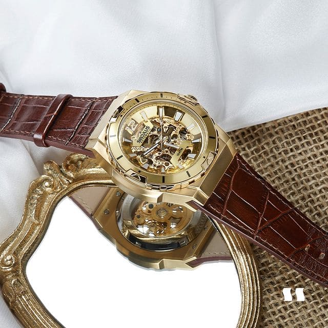 Este relógio é um modelo elegante e moderno com movimento automático. O destaque está no mostrador transparente com todo o mecanismo à mostra, possui caixa em aço dourada com catraca serrilhada. A pulseira de couro marrom do relógio possui acabamento croco e fechamento por fivela, facilitando o ajuste no pulso. Esse relógio possui a caixa em 4,5 cm de tamanho.